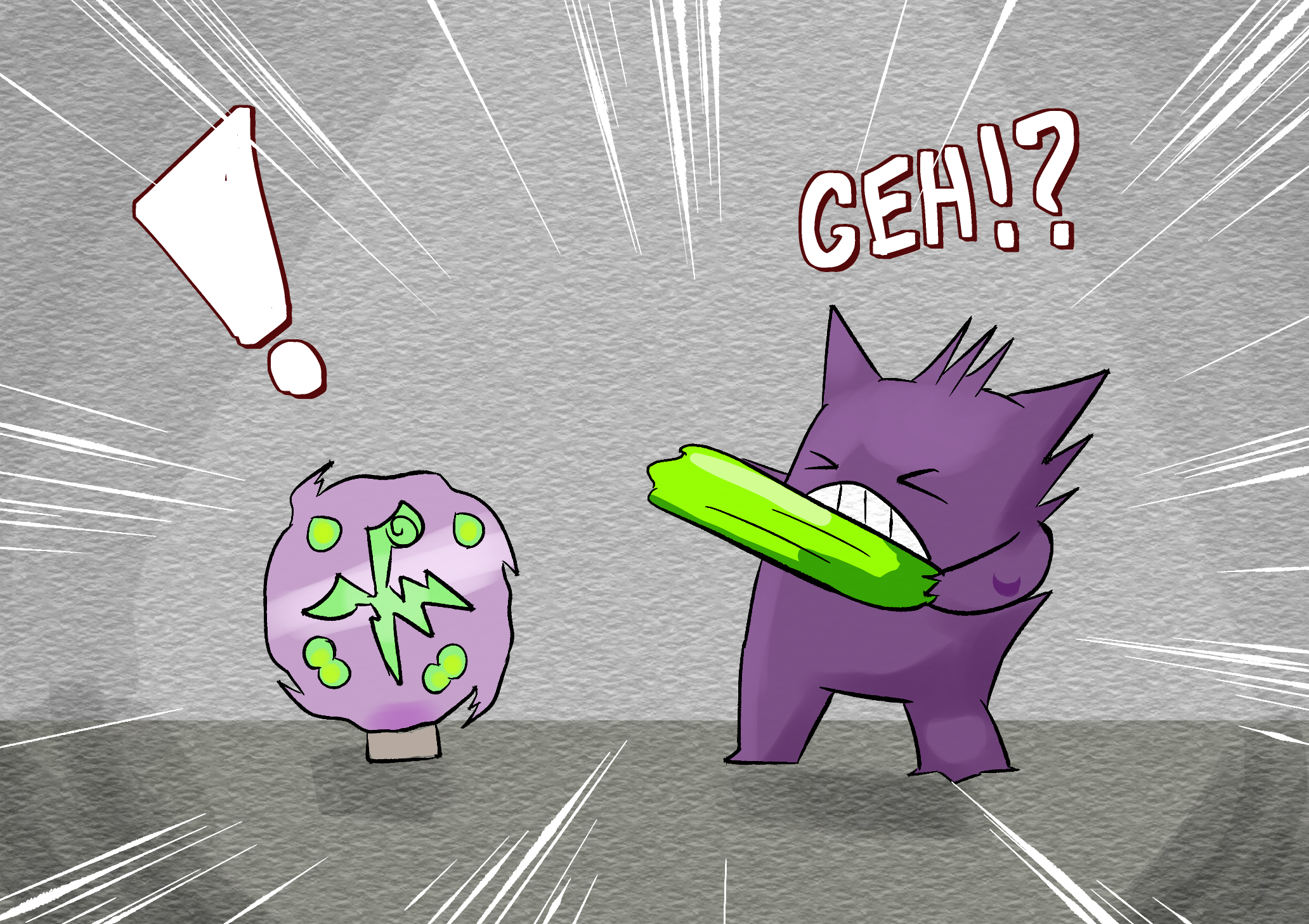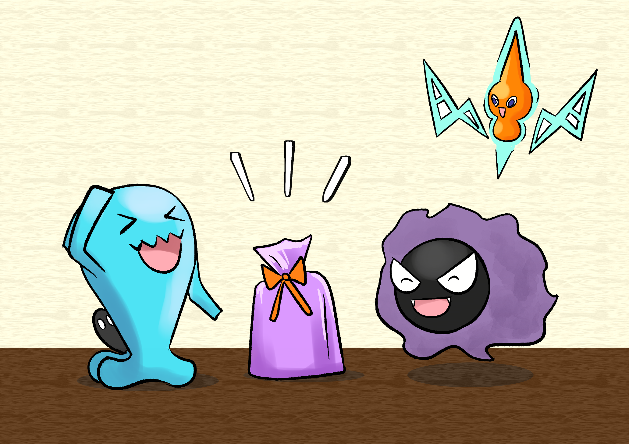That question has been wracking the brains of Jinji’s ghostly family for years and has been a regular topic of discussion behind closed doors. One night, though, the ghosts hit upon a solution. If they can’t invite the friends to the mansion for a party, why can’t they visit each of the friends at their homes and allow them to contribute a gift to the party back in the Spirit Realm? Each can also leave Jinji their own special message to wish Jinji a great year. That way, they can be part of the party without being physically present!First, Phantisserie and Alessandro pay a visit to Cat, one of Jinji’s few non-Pokémon friends. Cat had been preparing for Jinji’s party well in advance and quickly hands over a small, black-and-green present for them to deliver to Jinji on the day.Next, the Ghosts visit a self-help retreat, where for several months, Kitty the Gengar Queen has been staying, seeking to strengthen her body and mind. “It’s been so long since we’ve seen each other!”, she exclaims, as she happily hands over a blue-and-pink wrapped present to Gaspar and Enigma.Gaspar and Alessandro later visit Team Plasma – not the villaneous Pokémon trainer group, but the ragtag group of Pokémon lead by Ectoplasma the Gengar. However, it’s actually Wobb the Wobbuffet from the team who ends up handing over the gift, a pink gift bag wrapped in an orange bow which seems to contain something square-shaped and weighty.Celeste next visits a beautiful, tree-laden field, where a community of animals exist and live in a manner that’s almost human. Frolicking within this community, Celeste finds an unusual yellow squirrel wearing a blue shirt with a pink doughnut print on its front. The squirrel, called Cookie, blends in well with his fellow animals; but secretly, Celeste knows Cookie is actually a shapeshifter called FormFitter, a being who regularly travels between different universes and takes on forms to blend in with his surroundings without ever drawing suspicion. Celeste waits for an appropriate moment when Cookie is away from the other animals, and approaches him to discuss Jinji’s upcoming Birthday. Cookie, without hesitation, pulls out a tall but thin present and hands it over to Celeste for the party, and the two depart before anyone sees what happened.Elsewhere in the field, Phantisserie bumps into Jinji’s Abra pal (and IRL fellow colleague from Pokémon World Online), AsianKid. “Heard you guys were collecting gifts for Jinji’s party”, he says knowingly, and he psychically summons a small present in mid-air directly in front of the impressed Haunter.AsianKid wasn’t the only one of Jinji’s friends to summon their gift out of thin air, though. Gaspar meets Charlotte, the Witch Espurr, who uses her magical abilities to create a present as well!Just as Gaspar is about to return to the Spirit Realm with the rest of the Ghosts, however, he’s suddenly stopped by an unexpected visitor… “Jinji the Gengar, huh? I have a little special something for my ‘old friend’…” “Mr. Mime?!?”Returning home, Celeste and Enigma put together a rudimentary computer and enter into the Digital Realm, to meet up with Jinji’s final friend, Zain the Veemon. Dressed up in a Lightdramon hoodie, Veemon greets the Ghosts with glee and hands over a green bag containing his gift; along with a small digital tablet, to allow him to speak to Jinji through video during the party himself. The ghosts are impressed with Zain’s creativity!With all the presents gathered together, the ghosts come up with one more idea to give Jinji an even bigger surprise. The spirits each carefully unpack the presents from all of Jinji’s friends, and re-package each one inside a special gift bomb, each with its own uniquely colourful design. The ghosts then gather all the bombs into one huge pile, to present to Jinji at the party. “This is gonna be a BLAST!”, they joke to each other.Just then, Jinji arrives for the party – and is totally taken aback by what he sees! “Surprise, Jinji!”, the Ghosts all shout, as they present him with the pile of gift bombs.“Gehehe! I can’t believe all of you went to the trouble of preparing a whole heap of gift bombs for my presents!” Giggling with excitement, Jinji immediately picks one of the larger bombs from the pile, and prepares to light the fuse…KA-SPLAT! To Jinji’s shock, the bomb doesn’t open up to reveal a present as he expected. Instead, it bursts apart and sprays him with a dose of slime!“Gahaha! Surprise, Jinji! It’s not just all your friends who left gifts! You see, we all decided to create a bunch of slime bombs to mix into the pile as well, each one ready to make a mess should you be unlucky to light them. Good luck figuring out which bomb is which, though…!” Jinji frowns with annoyance as the Ghosts all laugh at his slime-coated face.Thankfully, Jinji’s embarrassment quickly subsides, and he’s quickly back to the pile to take another bomb. This time, he’s lucky, and the explosive splits apart harmlessly, to reveal a card from his Abra friend, AsianKid, and… a TwistedSpoon? Jinji looks at AsianKid’s gift in confusion, wondering what he’s supposed to do with such a strange ornament, but soon, he’s laughing along with the Ghosts at AsianKid’s cheeky sense of humour.Exploding a gold-coloured bomb next, Jinji is overjoyed to find two books inside – one labelled ‘Potions’, and another labelled ‘Poisons’. Jinji immediately opens one of the books and begins reading eagerly, giggling when he sees a ‘Happy Birthday’ note from Wobb written inside.Reaching into the pile again, Jinji picks up a tiny, pink bomb and can’t help but giggle. “Geheh, what a cute, tiny explosive this is!”, he chuckles. “Surely there’s no way this can–”SPLOOOSH! The tiny bomb bursts into a colossal mass of slime, splashing not just Jinji, but making a mess of the entire room! “Ga-has! We warned you, Jinji!”,