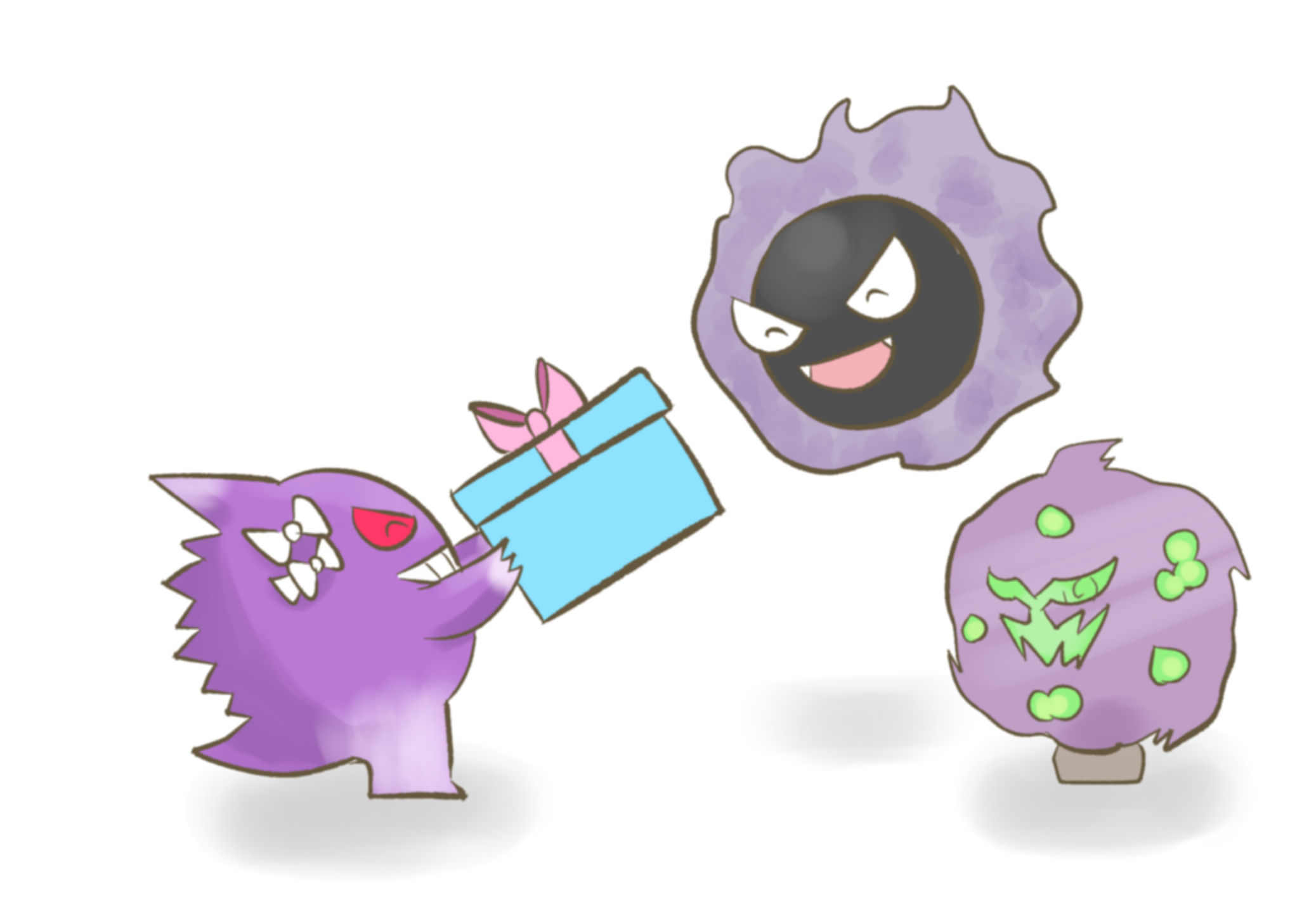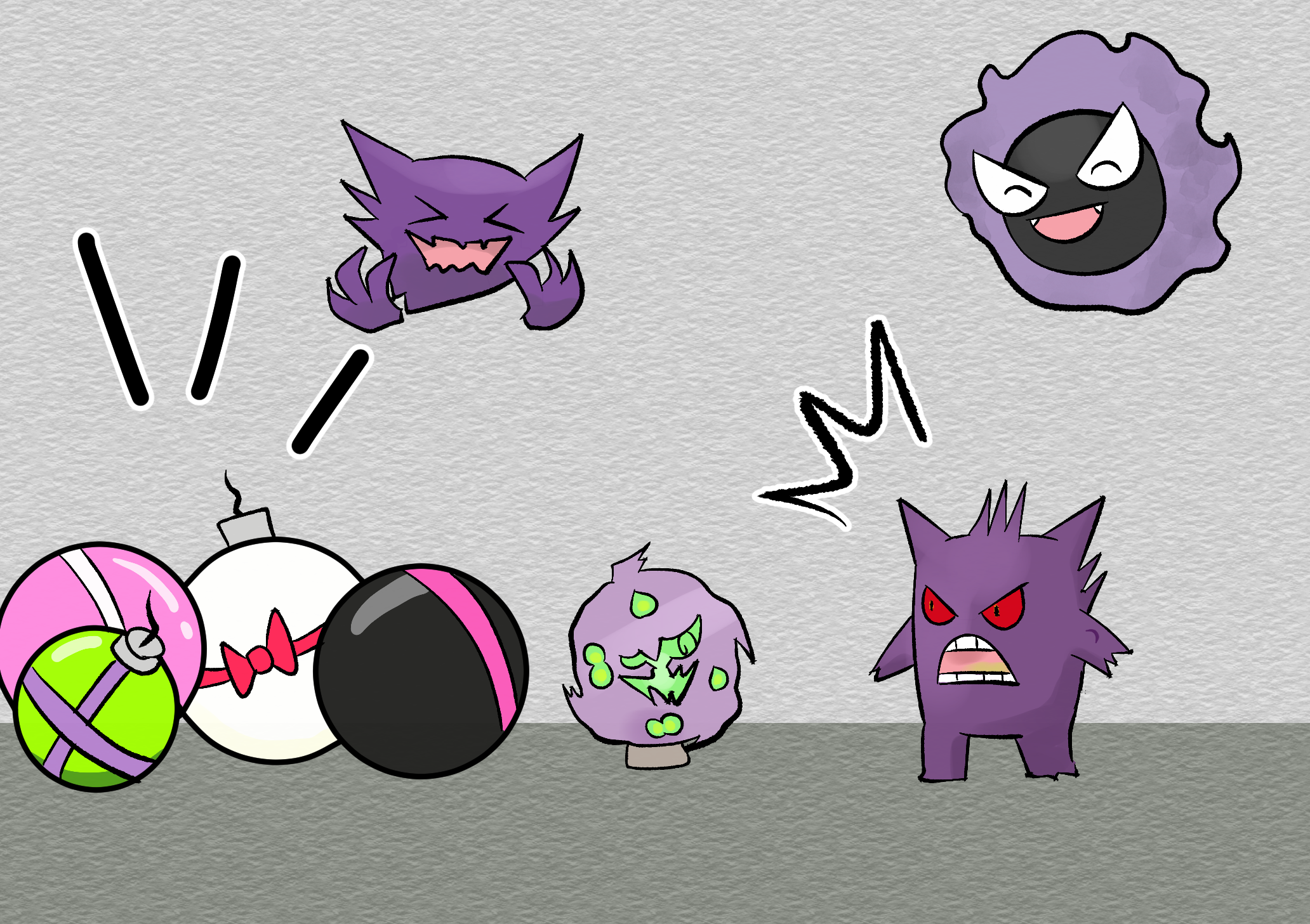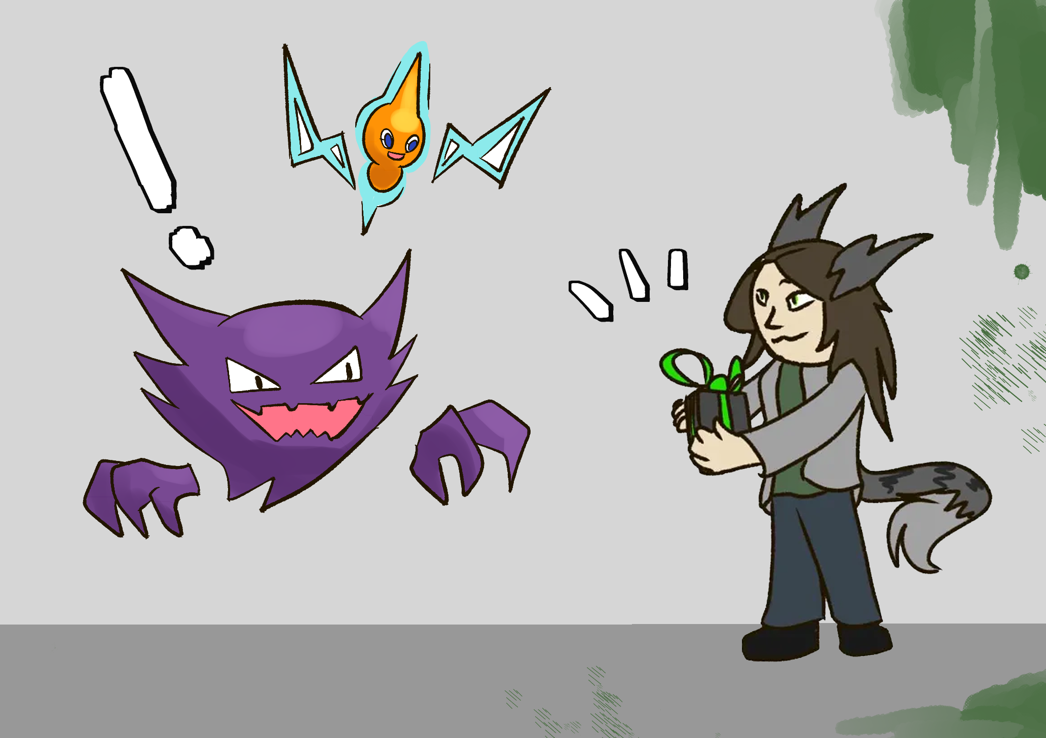 That question has been wracking the brains of Jinji’s ghostly family for years and has been a regular topic of discussion behind closed doors. One night, though, the ghosts hit upon a solution. If they can’t invite the friends to the mansion for a party, why can’t they visit each of the friends at their homes and allow them to contribute a gift to the party back in the Spirit Realm? Each can also leave Jinji their own special message to wish Jinji a great year. That way, they can be part of the party without being physically present!First, Phantisserie and Alessandro pay a visit to Cat, one of Jinji’s few non-Pokémon friends. Cat had been preparing for Jinji’s party well in advance and quickly hands over a small, black-and-green present for them to deliver to Jinji on the day.Next, the Ghosts visit a self-help retreat, where for several months, Kitty the Gengar Queen has been staying, seeking to strengthen her body and mind. “It’s been so long since we’ve seen each other!”, she exclaims, as she happily hands over a blue-and-pink wrapped present to Gaspar and Enigma.Later, Phantisserie bumps into Jinji’s Abra pal (and IRL fellow colleague from Pokémon World Online), AsianKid. “Heard you guys were collecting gifts for Jinji’s party”, he says knowingly, and he psychically summons a small present in mid-air directly in front of the impressed Haunter.Returning home, Celeste and Enigma put together a rudimentary computer and enter into the Digital Realm, to meet up with Jinji’s final friend, Zain the Veemon. Dressed up in a Lightdramon hoodie, Veemon greets the Ghosts with glee and hands over a green bag containing his gift; along with a small digital tablet, to allow him to speak to Jinji through video during the party himself. The ghosts are impressed with Zain’s creativity!With all the presents gathered together, the ghosts come up with one more idea to give Jinji an even bigger surprise. The spirits each carefully unpack the presents from all of Jinji’s friends, and re-package each one inside a special gift bomb, each with its own uniquely colourful design. The ghosts then gather all the bombs into one huge pile, to present to Jinji at the party. “This is gonna be a BLAST!”, they joke to each other.Just then, Jinji arrives for the party – and is totally taken aback by what he sees! “Surprise, Jinji!”, the Ghosts all shout, as they present him with the pile of gift bombs. “Gehehe! I can’t believe all of you went to the trouble of preparing a whole heap of gift bombs for my presents!”Giggling with excitement, Jinji immediately picks one of the larger bombs from the pile, and prepares to light the fuse…KA-SPLAT! To Jinji’s shock, the bomb doesn’t open up to reveal a present as he expected. Instead, it bursts apart and sprays him with a dose of slime! “Gahaha! Surprise, Jinji! It’s not just all your friends who left gifts! You see, we all decided to create a bunch of slime bombs to mix into the pile as well, each one ready to make a mess should you be unlucky to light them! Good luck figuring out which bomb is which, though…!” Jinji frowns with annoyance as the Ghosts all laugh at his slime-coated face.Thankfully, Jinji’s embarrassment quickly subsides, and he’s quickly back to the pile to take another bomb. This time, he’s lucky, and the explosive splits apart harmlessly, to reveal a card from his Abra friend, AsianKid, and… a TwistedSpoon? Jinji looks at AsianKid’s gift in confusion, wondering what he’s supposed to do with such a strange ornament, but soon, he’s laughing along with the Ghosts at AsianKid’s cheeky sense of humour.Reaching into the pile again, Jinji picks up a tiny, pink bomb and can’t help but giggle. “Geheh, what a cute, tiny explosive this is!”, he chuckles. “Surely there’s no way this can–”SPLOOOSH! The tiny bomb bursts into a colossal mass of slime, splashing not just Jinji, but making a mess of the entire room! “Ga-has! We warned you, Jinji!”, Gaspar teases. “Don’t think the look or size of the bomb is any clue as to its contents! Even the tiniest one could be hiding the biggest surprise – or the biggest mess!” Jinji groans, wondering how such a small explosive could even contain such an enormous amount of goo.